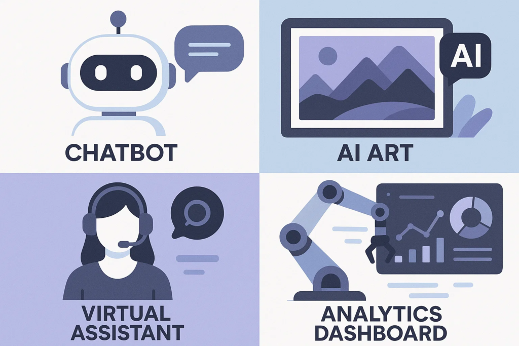 • Creative Design & Media: AI image generators, music composers, and video production tools.